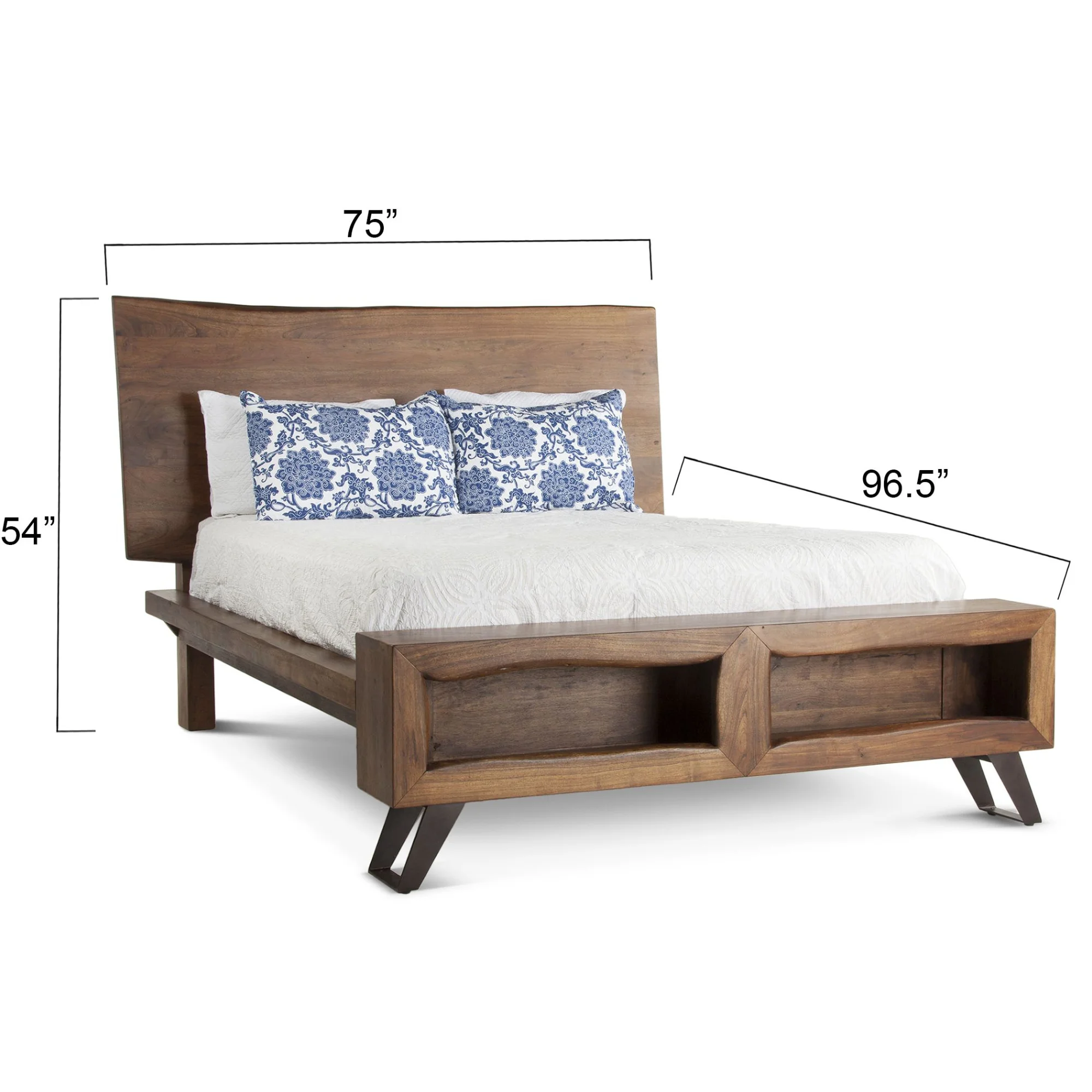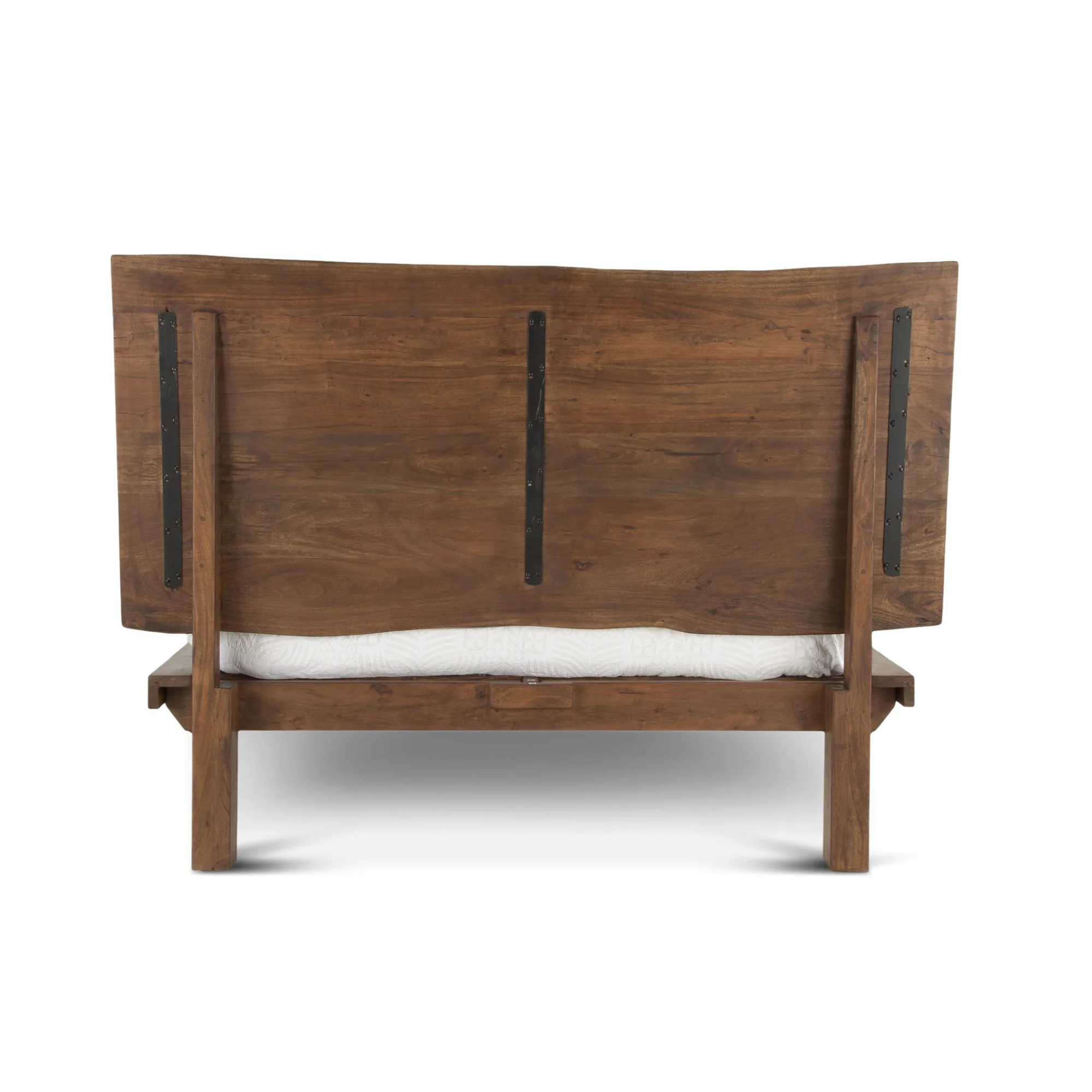 The London Loft Queen Bed blends the organic beauty of Acacia wood with sleek industrial design. Crafted from thick slabs of solid wood, the headboard and footboard feature natural live edge detailing that highlights the unique grain and texture of each piece. The footboard includes open display shelving with sculpted live edge framing—perfect for storing and showcasing decor or essentials. Angled iron legs add a modern contrast and visual lightness, while solid wood slats provide lasting support.